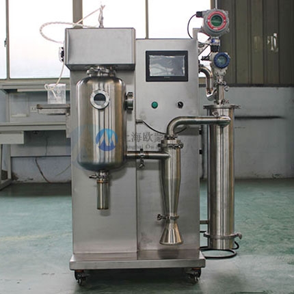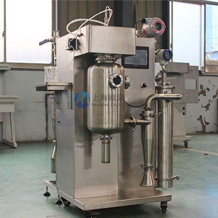 首先在開啟風(fēng)機,加熱模塊,干燥塔體內(nèi)充入氮氣,要被干燥的液態(tài)物料經(jīng)輸液泵輸送至噴頭處,液態(tài)物料被霧化器霧化成細(xì)小液滴,液滴在干燥塔內(nèi)與熱氮氣進行充分的熱交換,物料中的液態(tài)部分被瞬間蒸發(fā),固態(tài)部分形成的粉狀物料沉于塔底,*后經(jīng)過旋風(fēng)分離器進行氣固分離至物料收集瓶,溶劑經(jīng)過冷凝器回收,氣體循環(huán)利用。